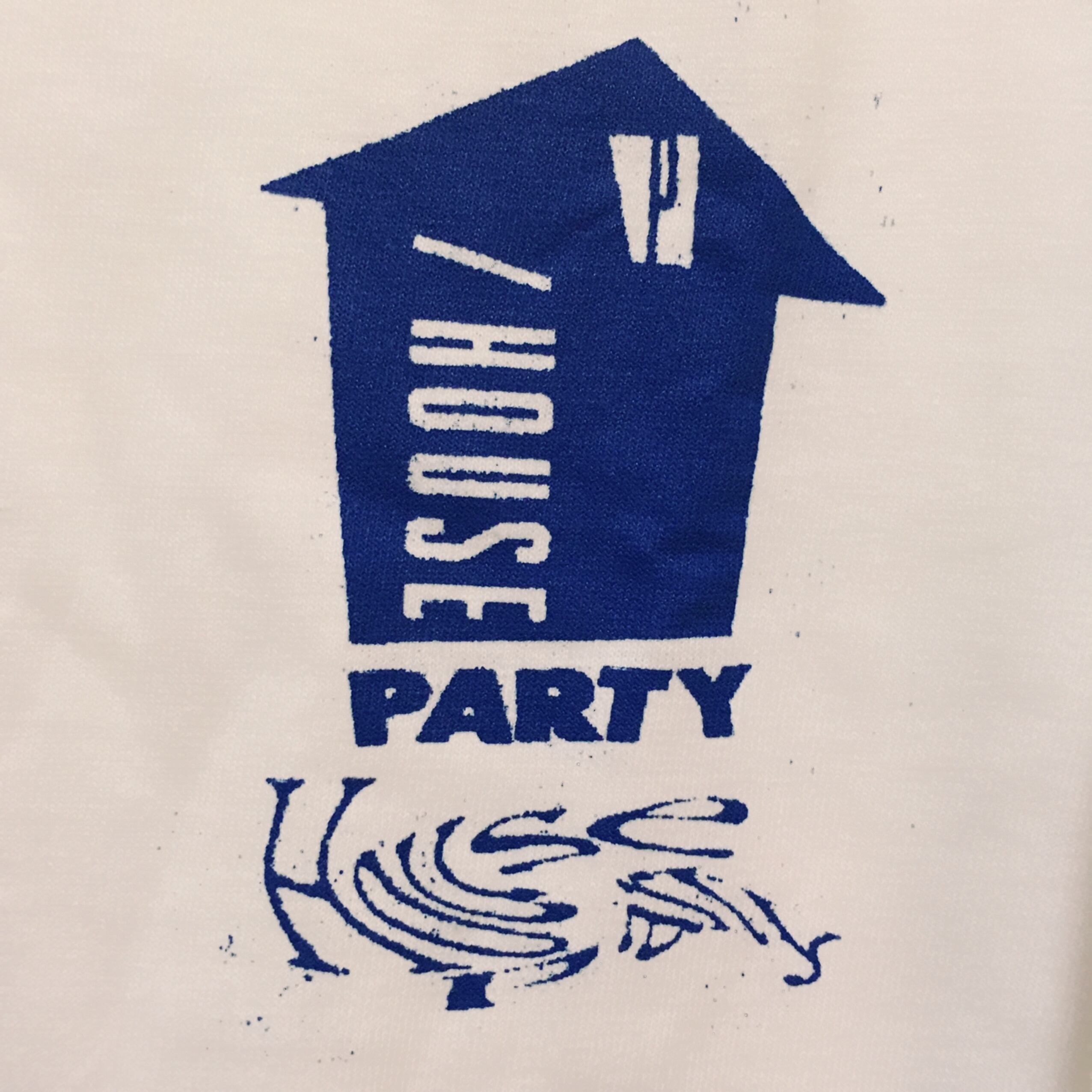 90年代初頭の映画HOUSE PARTYをモチーフにしたポンコツロゴを爽やかに青色で左胸に、右袖と背面にP/ HOUSEロゴを黒でシルクプリント!