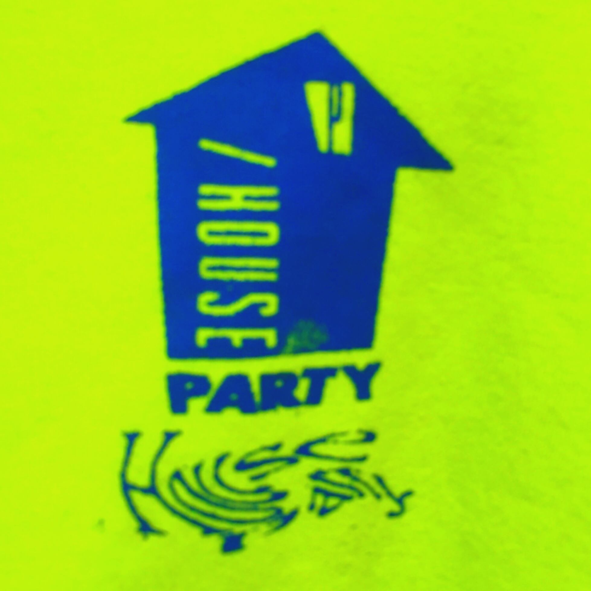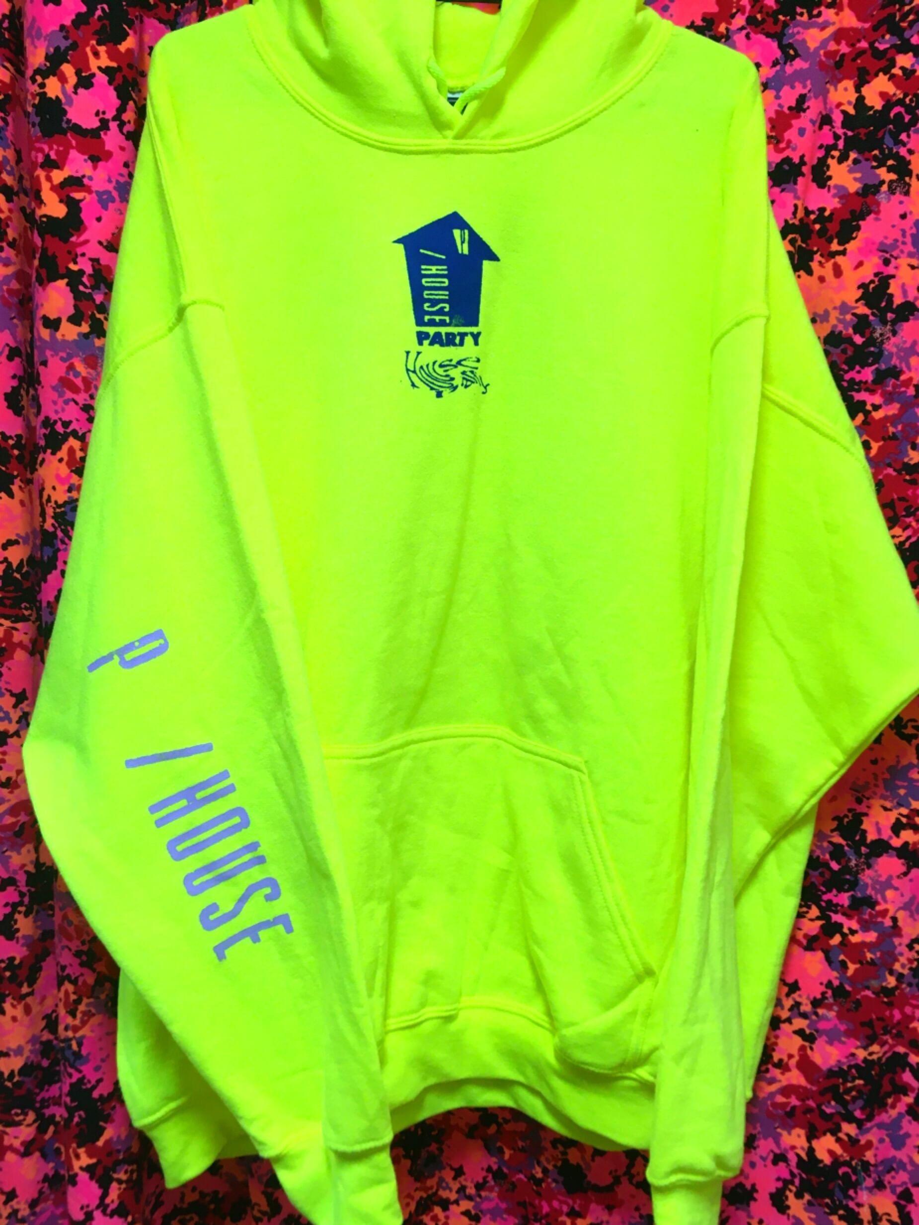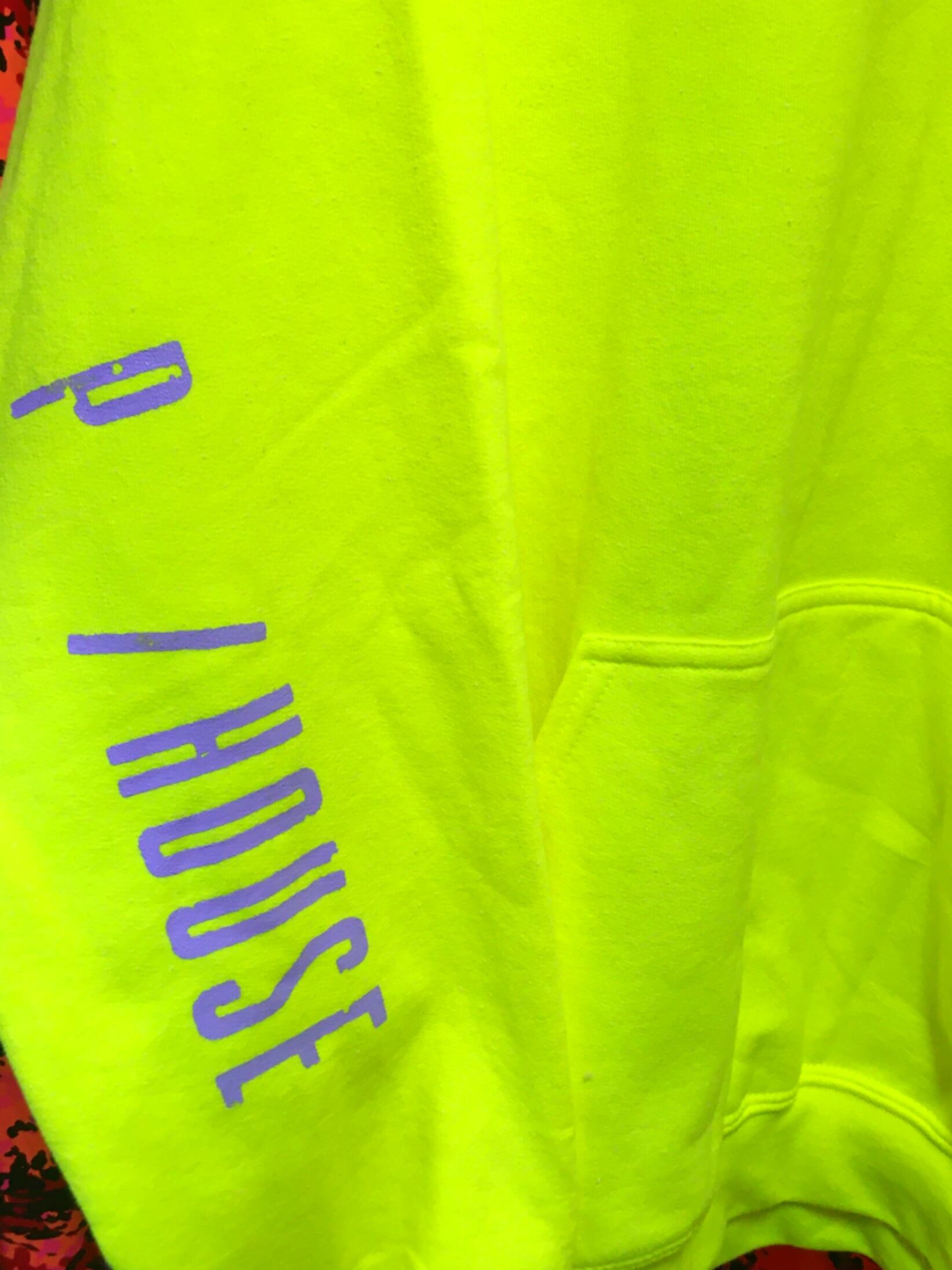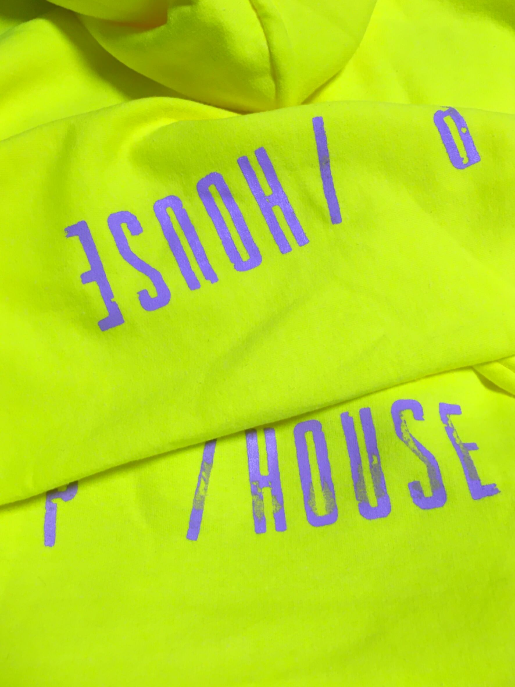 90年代初頭の映画HOUSE PARTYをモチーフにしたポンコツロゴをネオンイエローのプルオーバーパーカーの首元に青色で右腕と背面にP/ HOUSEロゴをライトパープルでシルクプリント!