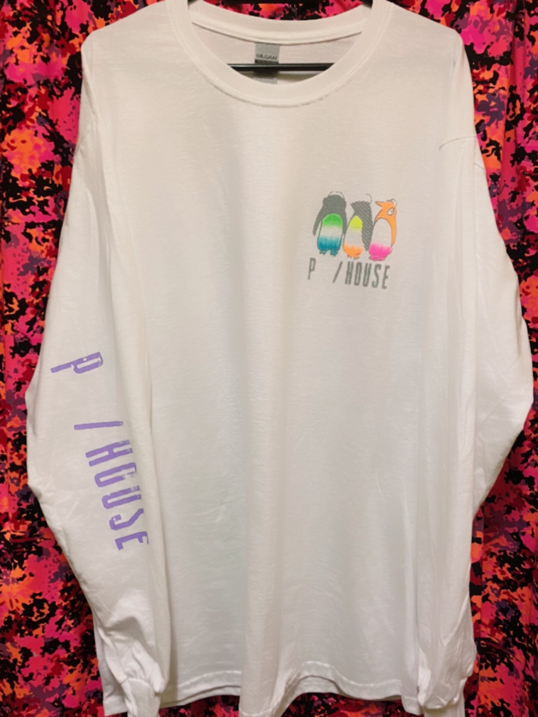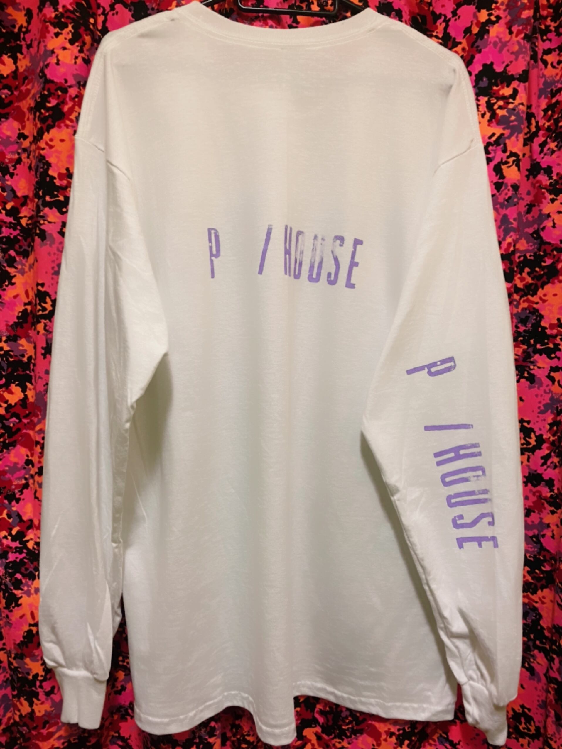 背面と右袖にパステルパープルで「P /HOUSE」をシルクプリント。